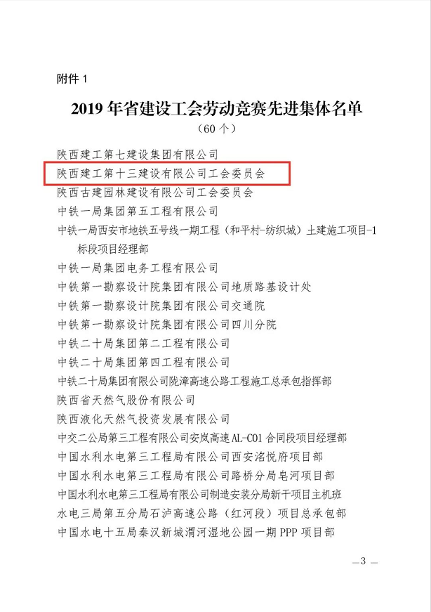 日前,陜西省建設(shè)工會(huì)通報(bào)表彰2019年勞動(dòng)競(jìng)賽和助力脫貧攻堅(jiān)競(jìng)賽先進(jìn)集體、先進(jìn)個(gè)人。陜建十三建公司工會(huì)委員會(huì)榮獲“2019年陜西省建設(shè)系統(tǒng)勞動(dòng)競(jìng)賽先進(jìn)集體”稱(chēng)號(hào)。