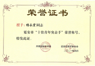 陜建十三建集團(tuán)團(tuán)委被授予“延安市五四紅旗團(tuán)委”稱號(hào),集團(tuán)南泥灣現(xiàn)代農(nóng)業(yè)示范園項(xiàng)目青年突擊隊(duì)被授予“延安市青年突擊隊(duì)”稱號(hào),楊永宏被授予“延安市十佳青年突擊手”稱號(hào),薛淑元被授予“延安市優(yōu)秀共青團(tuán)干部”稱號(hào),楊超被授予“延安市青年突擊手”稱號(hào),李大衛(wèi)被授予“延安市青年崗位能手”稱號(hào)。