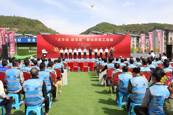 在第四個(gè)“中國(guó)農(nóng)民豐收節(jié)”到來(lái)之際,9月22日,陜西省總工會(huì)走進(jìn)陜建十三建集團(tuán)延安南泥灣勞模工匠學(xué)院項(xiàng)目,開(kāi)展“慶豐收、感黨恩”慰問(wèn)農(nóng)民工活動(dòng)。