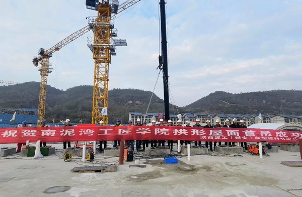 延安南泥灣勞模工匠學(xué)院項(xiàng)目預(yù)制拱型屋面首吊順利完成