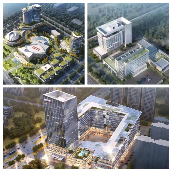 項(xiàng)目鳥瞰圖:上左-國際健美健身聯(lián)合會(huì)IFBB-CBBA文化發(fā)展交流中心項(xiàng)目;上右-空港領(lǐng)航大廈項(xiàng)目二期;下-渭城商務(wù)功能區(qū)項(xiàng)目