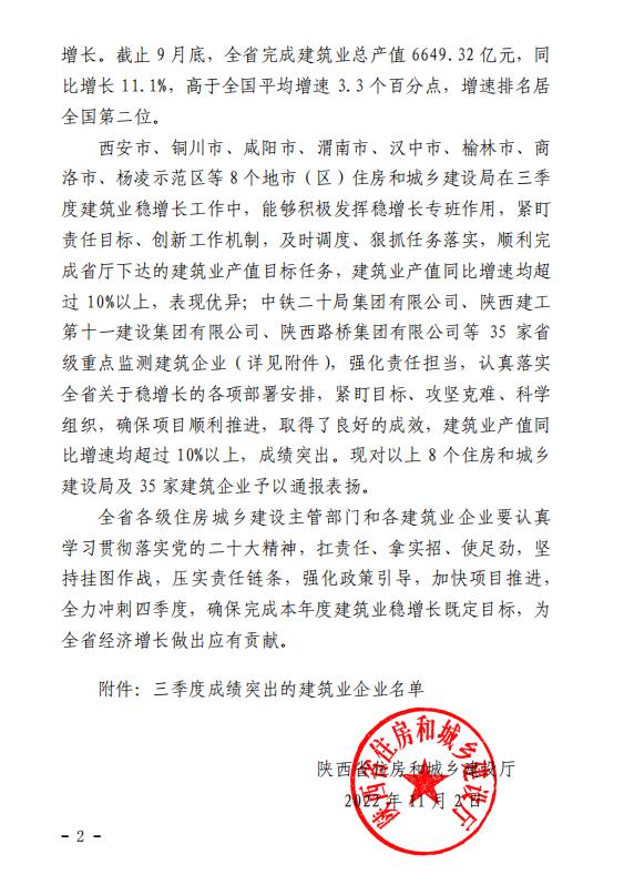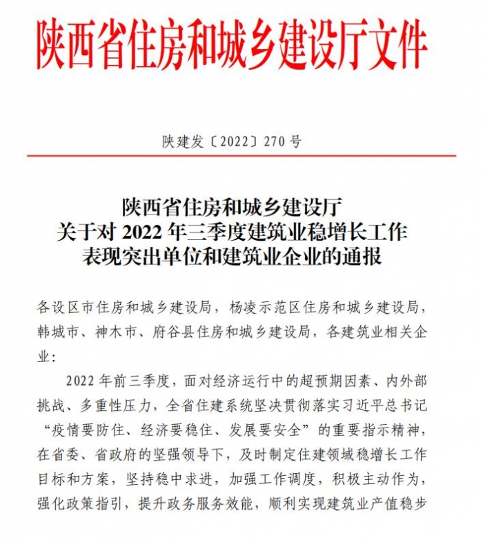 11月2日,陜西省住房和城鄉(xiāng)建設(shè)廳發(fā)布《關(guān)于對2022年三季度建筑業(yè)穩(wěn)增長工作表現(xiàn)突出單位和建筑業(yè)企業(yè)的通報》,集團(tuán)被省住建廳評為“三季度成績突出建筑業(yè)企業(yè)”。