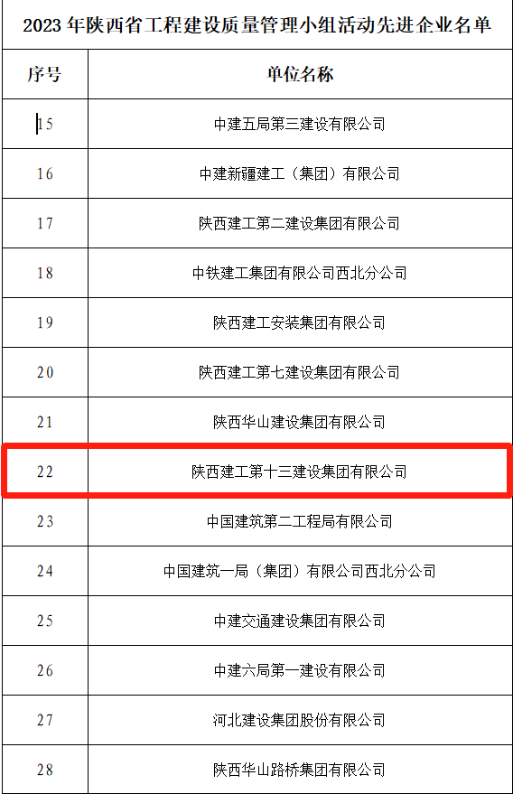 近日,陜西省建筑業(yè)協(xié)會表彰了2023年度陜西省工程建設(shè)優(yōu)秀QC小組、QC小組活動先進(jìn)企業(yè)、卓越領(lǐng)導(dǎo)者、優(yōu)秀推進(jìn)者。集團(tuán)24項(xiàng)成果榮獲“2023年陜西省工程建設(shè)優(yōu)秀QC小組”(其中I類成果獎(jiǎng)11項(xiàng),II類成果獎(jiǎng)12項(xiàng),III類成果獎(jiǎng)1項(xiàng))