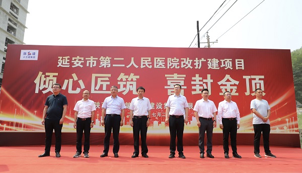 延安大學(xué)附屬醫(yī)院副院長祁軍利,延安市第二人民醫(yī)院院長武劍峰,延安城投集團(tuán)副總經(jīng)理劉靜,陜建十三建集團(tuán)副總經(jīng)理?xiàng)钣篮辍⒖偣こ處熗鹾肫?、副總?jīng)理張鑫偉,延安城投基建公司執(zhí)行董事趙明,中昕國際項(xiàng)目管理有限公司二院項(xiàng)目總監(jiān)白亮亮等出席封頂儀式。