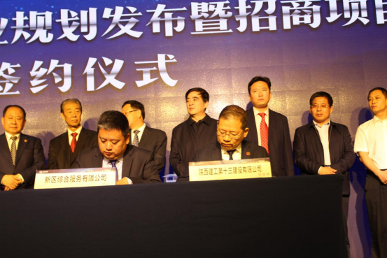 陜建十三建公司董事長卜國平(右)與新區(qū)綜合服務有限公司董事長王磊代表雙方簽約。